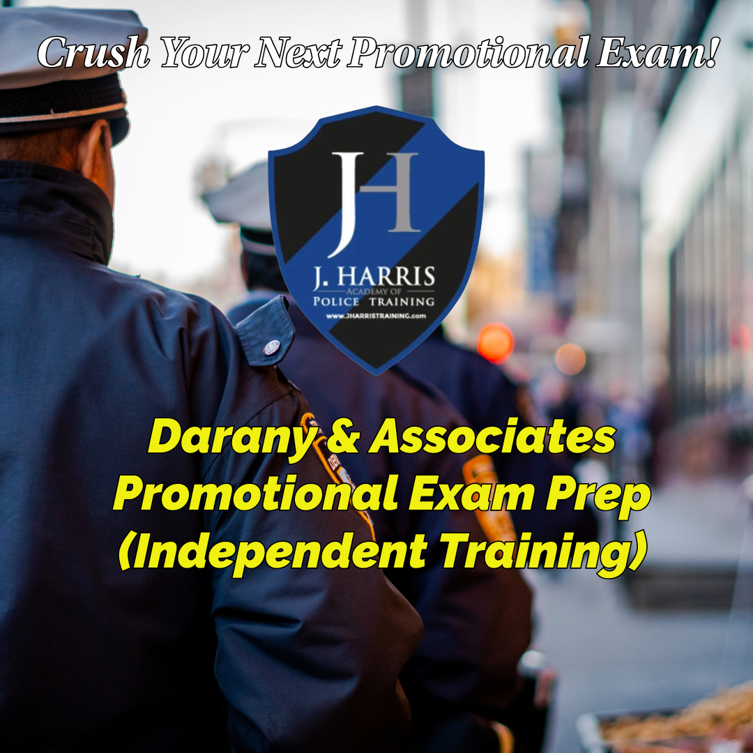 Many agencies across the country use Darany & Associates promotional exams for Sergeant, Lieutenant, and Captain testing. These exams often include written supervisory questions, situational-judgment scenarios, and leadership decision-making. At the J. Harris Academy of Police Training, we offer independent preparation designed to help you excel on Darany-style promotional tests. We are not affiliated with Darany & Associates.